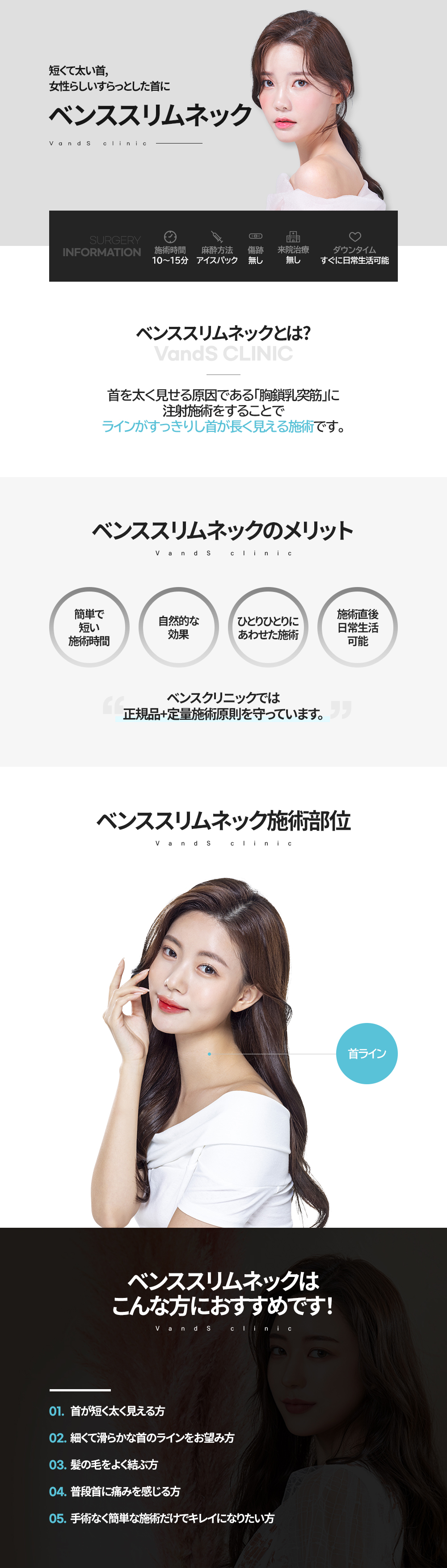首を太く見せる原因である首斜筋(胸鎖乳突筋)に注射施術を行い、首のラインが細くなり、首が長く見える施術です。