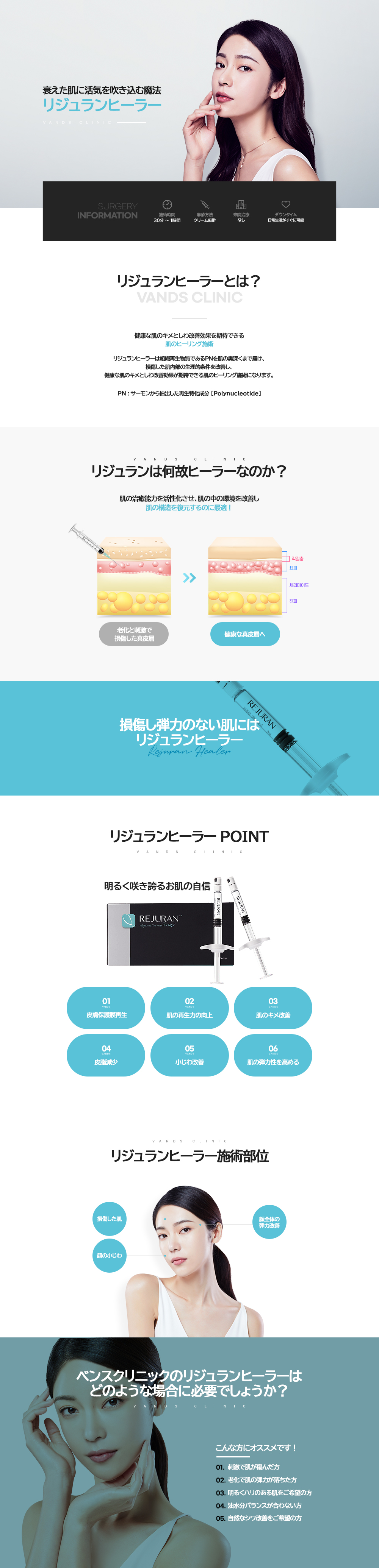 リジュランヒーラーは、生体適合物質であるポリヌクレオチド (PN、polynucleotide)という成長因子複合体で、単純に表皮層に 水分を供給するマスクパックとは異なり、薄く伸びた肌の表皮層と 真皮層の根本的な再生を通じて肌を健康でハリと弾力のある状態へ導く施術です。