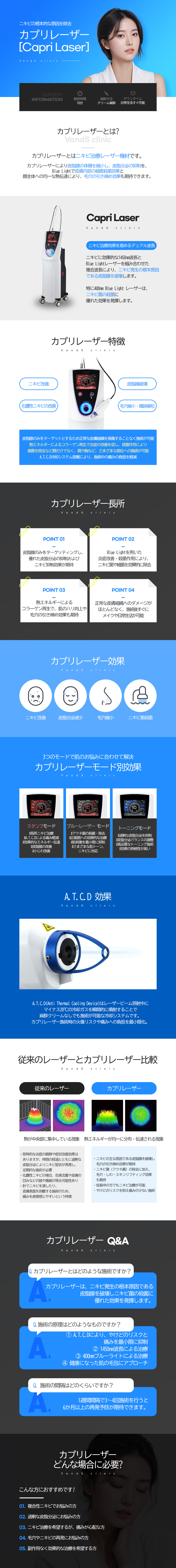 カプリレーザーは、ニキビに効果的な1450nmダイオードレーザーと400nm波長のブルーライトレーザーの複合波長を使用し、ニキビの根本的な原因である皮脂腺を破壊する効果が期待できます。